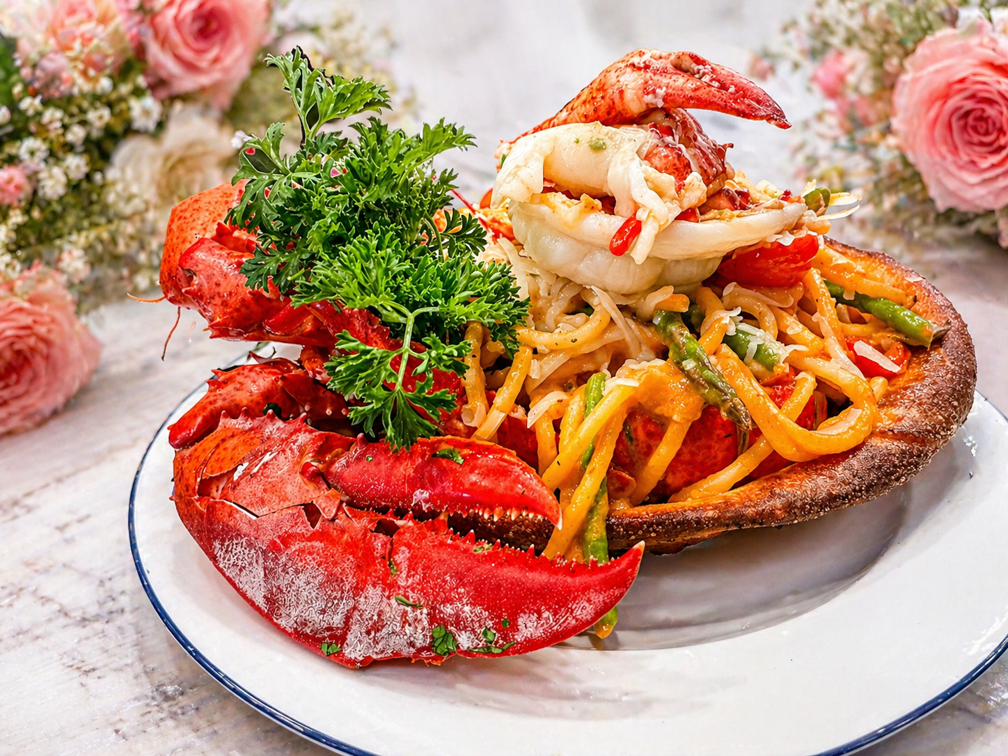 One Sunday a year, the table is hers. Make it count — lobster on the menu, a glass of something cold in her hand, a room she'll want to stay in past dessert.